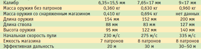 Возвратная пружина располагается вертикально внутри рукоятки, проходя вдоль ее переднего края, поэтому для соединения затвора с пружиной требуется специальный рычаг. В отличие от большинства других пистолетов, у этого оружия нет предохранителя. Защелка ствола соединяется с магазином таким образом, что при извлечении последнего казенник ствола сразу же поднимается, предотвращая случайный выстрел, если патрон остается в патроннике.