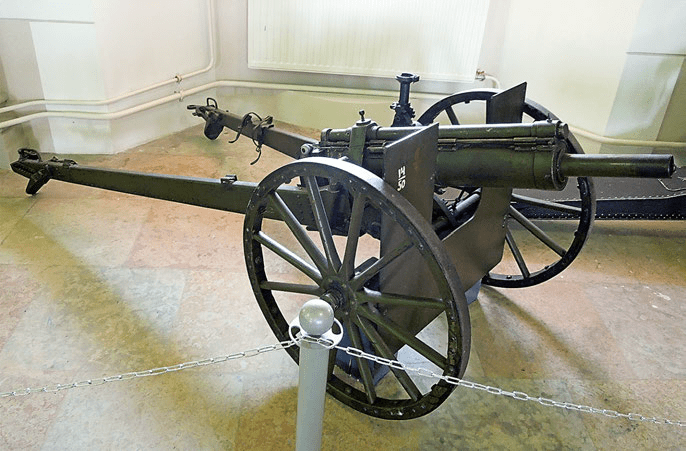 Поэтому в 1918–1924 гг. главным источником приобретения новой «продвинутой» материальной части для Советской России стали иностранные интервенты всех мастей. Изгнав британские и французские экспедиционные войска с территории страны, Красная Армия «оприходовала» несколько десятков принадлежащих им артиллерийских орудий. Среди них попадались как хорошо известные еще с дореволюционных времен модели, так и новые образцы. В музейной экспозиции они представлены 84-мм «18-фунтовой» английской пушкой (RO QF 18-pdr gun), а также весьма редкой и очень совершенной в конструктивном плане 155-мм гаубицей системы Сен-Шамон (Canon de 155 C mle 1915 St.Chamond). Последняя система была выпущена в весьма небольшом количестве (около 400 экземпляров), поскольку французская армия в качестве основной тяжелой полевой гаубицы выбрала конструкцию фирмы «Шнейдер», близкую «родственницу» нашей 6-дм крепостной гаубицы обр. 1909 г. Еще одним уникальным экспонатом тех лет является 50‑мм гладкоствольная самодельная пушка, сделанная дальневосточными красными партизанами.