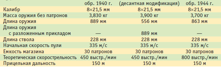 Цевье и ложе деревянные, у десантной модели 1944 г. приклад складывается.