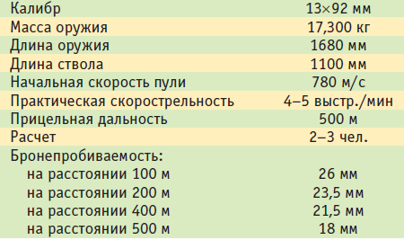 Оружие оснащено деревянной рукояткой пистолетного типа, складными сошками от пулемета MG 08/15, а также стандартным механическим прицелом. Боепитание осуществляется патронами калибра 13×92 мм. Пуля массой 52 г развивает начальную скорость 780 м/с и имеет дульную энергию 15 400 Дж. Масса порохового заряда — 13 г, масса всего патрона — 121 г.