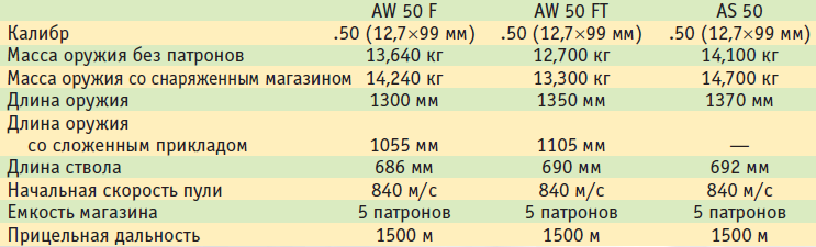 В настоящее время в арсенале компании «Accuracy International» есть снайперское оружие практически под все популярные на гражданском и военном рынках патроны: 5,56×45 NАТО, .243 «Remington» (6×51 мм), .300 «Winchester magnum» (7,62×67 мм), .308 «NATO Winchester» (7,62×51 мм) и .338 «Lapua magnum» (8,6×70 мм). Однако лишь несколько лет назад модельный ряд винтовок дополнился оружием под чрезвычайно популярный сейчас в Америке .50 «Browning» (12,7×99 мм).